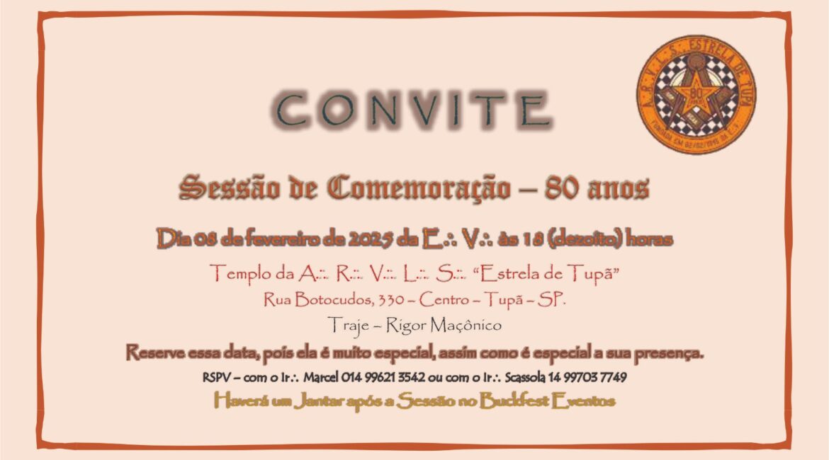Convite para a Sessão Magna de Comemoração dos 80 anos da ARVLS Estrela de Tupã